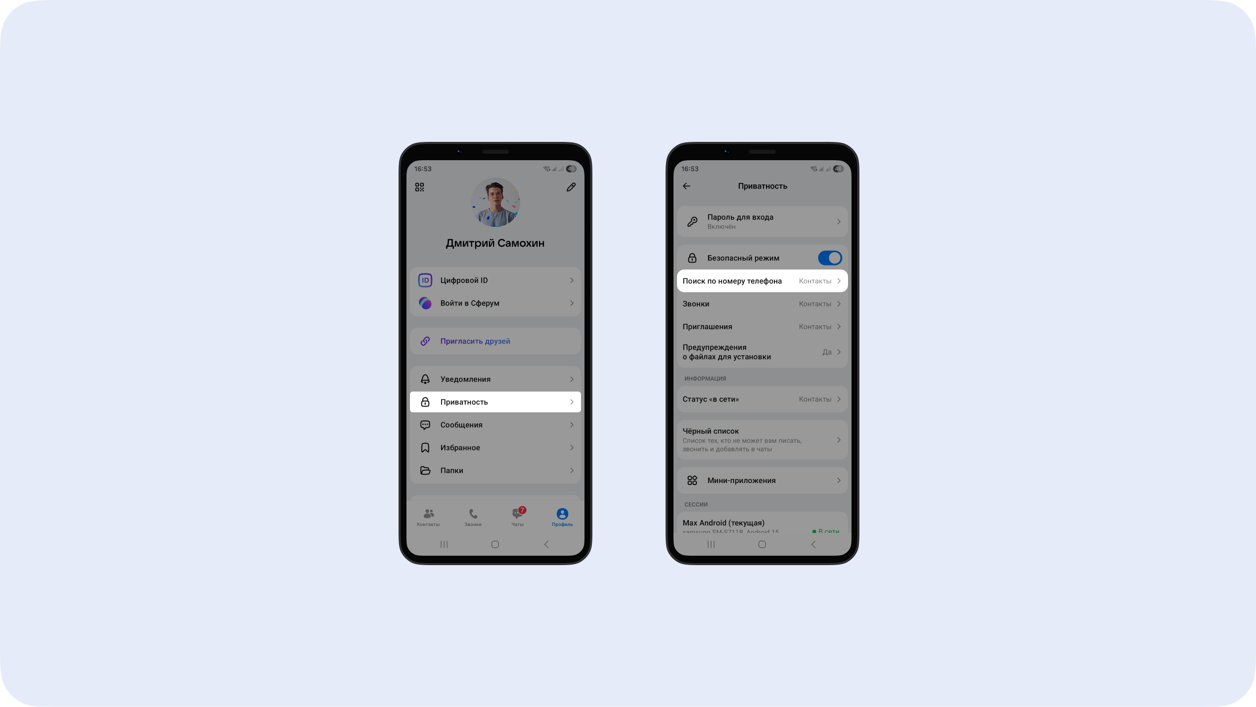 Для ограничения круга людей, которые могут найти вас по номеру телефона в MAX, перейдите в Профиль → Приватность → Поиск по номеру телефона → выберите Контакты.